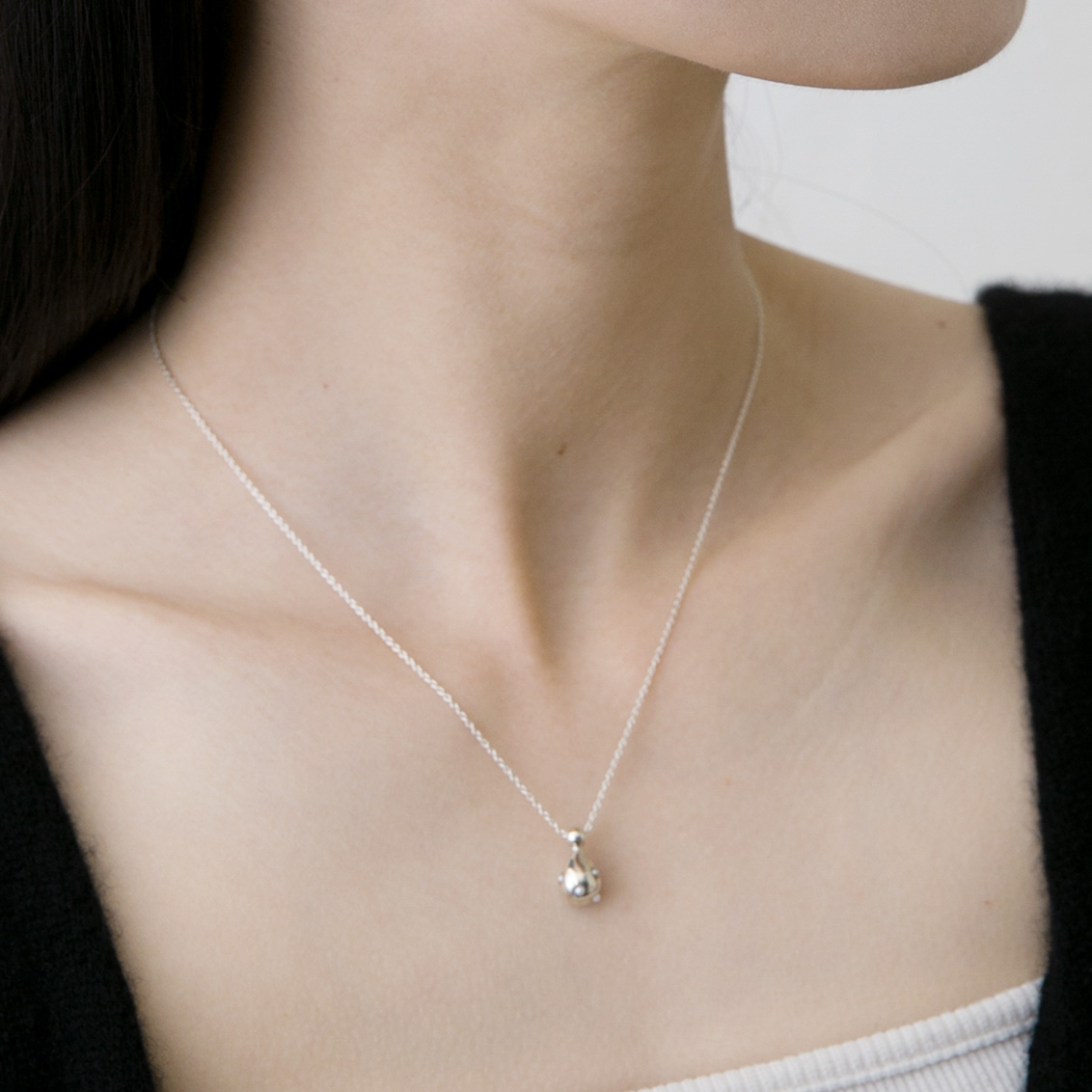 華奢なシルバーチェーンに、ドロップモチーフを一粒あしらったネックレス。トップには一つひとつ手作業で穴を開け、パールやシルバーの粒を添えています。まるで小さな芸術品のような、繊細で上品な仕上がりです。