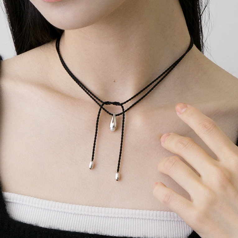 ドロップ型のトップに淡水パールを一粒添えた、シルクコードネックレス。金属アレルギーの方にも優しい素材で、スライド式で長さ調整も自在。