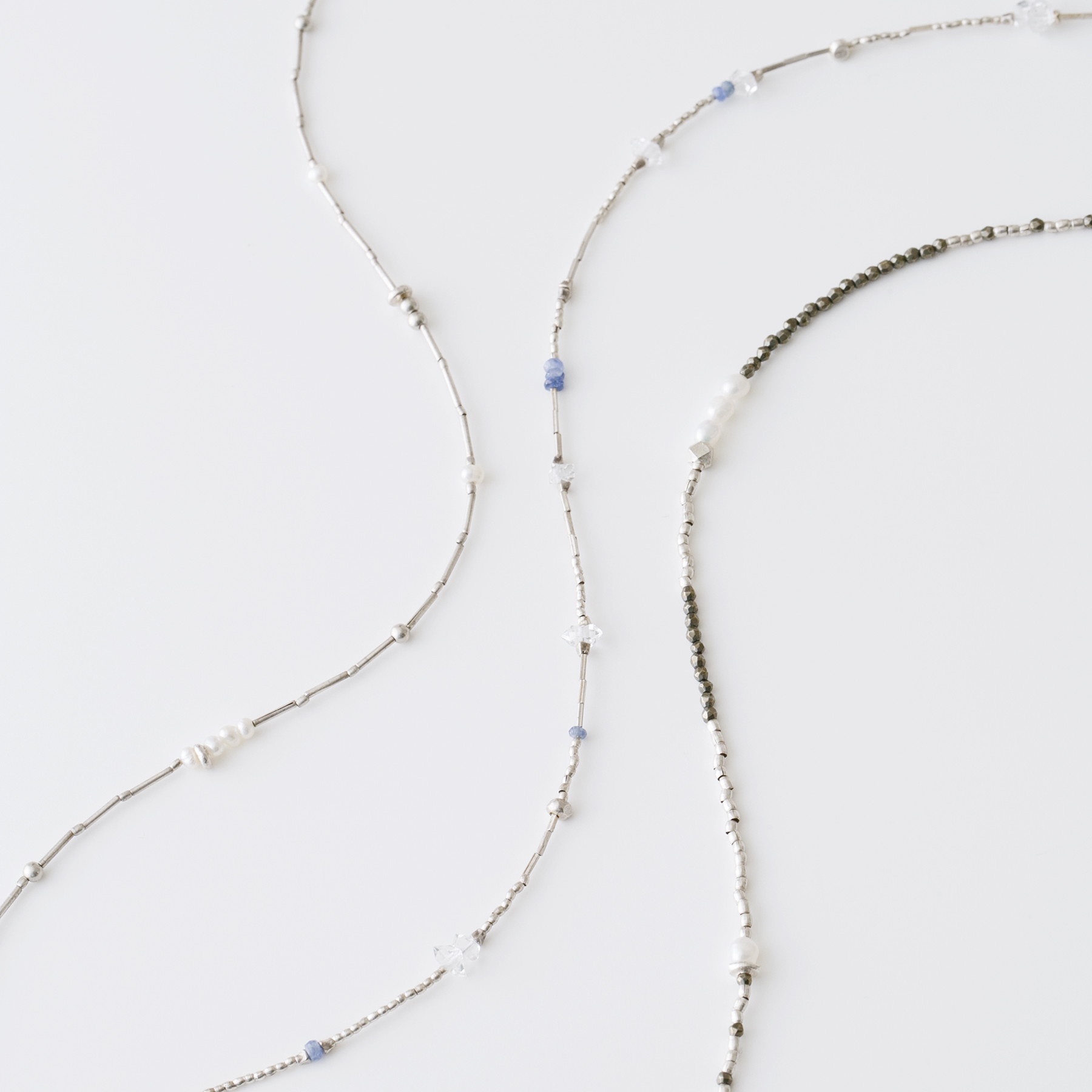 小さな天然石やパールを組み合わせ、雨粒のような繊細なビーズネックレス。カジュアルにもフォーマルにも寄り添う、ユニセックスなデザインです。