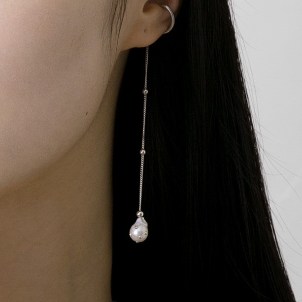 ロングチェーンとドロップパールを組み合わせた、優雅なイヤーカフ。揺れるたびに光を受けるシルバー粒が、静かな雨のしずくのように煌めきます。