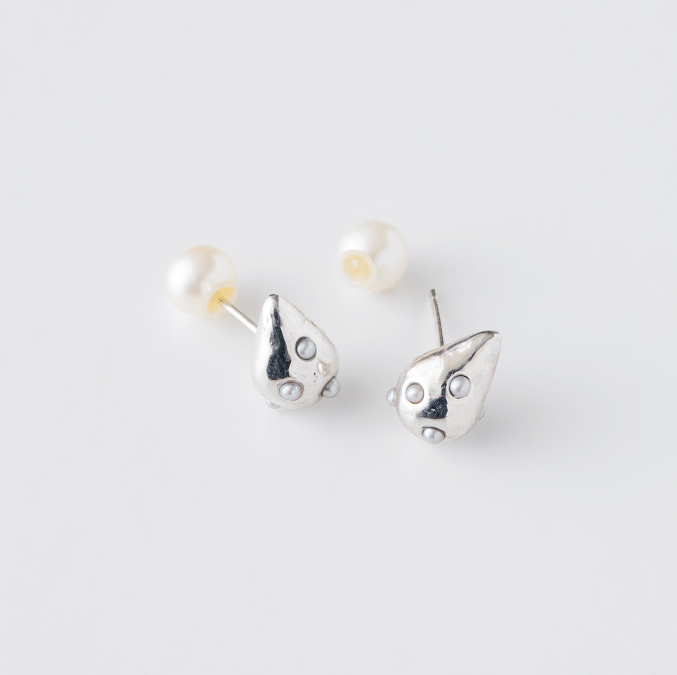 丁寧な手仕事で仕上げた、しずくモチーフのピアス。キャッチ部分にもパールを添え、前後を反転させて着けるなど、アレンジも楽しめます。