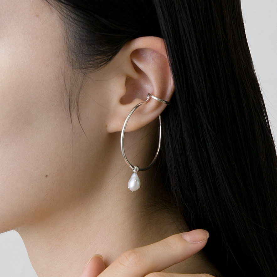 個性的なシルバーフープに、ドロップパールを組み合わせたイヤーカフ。