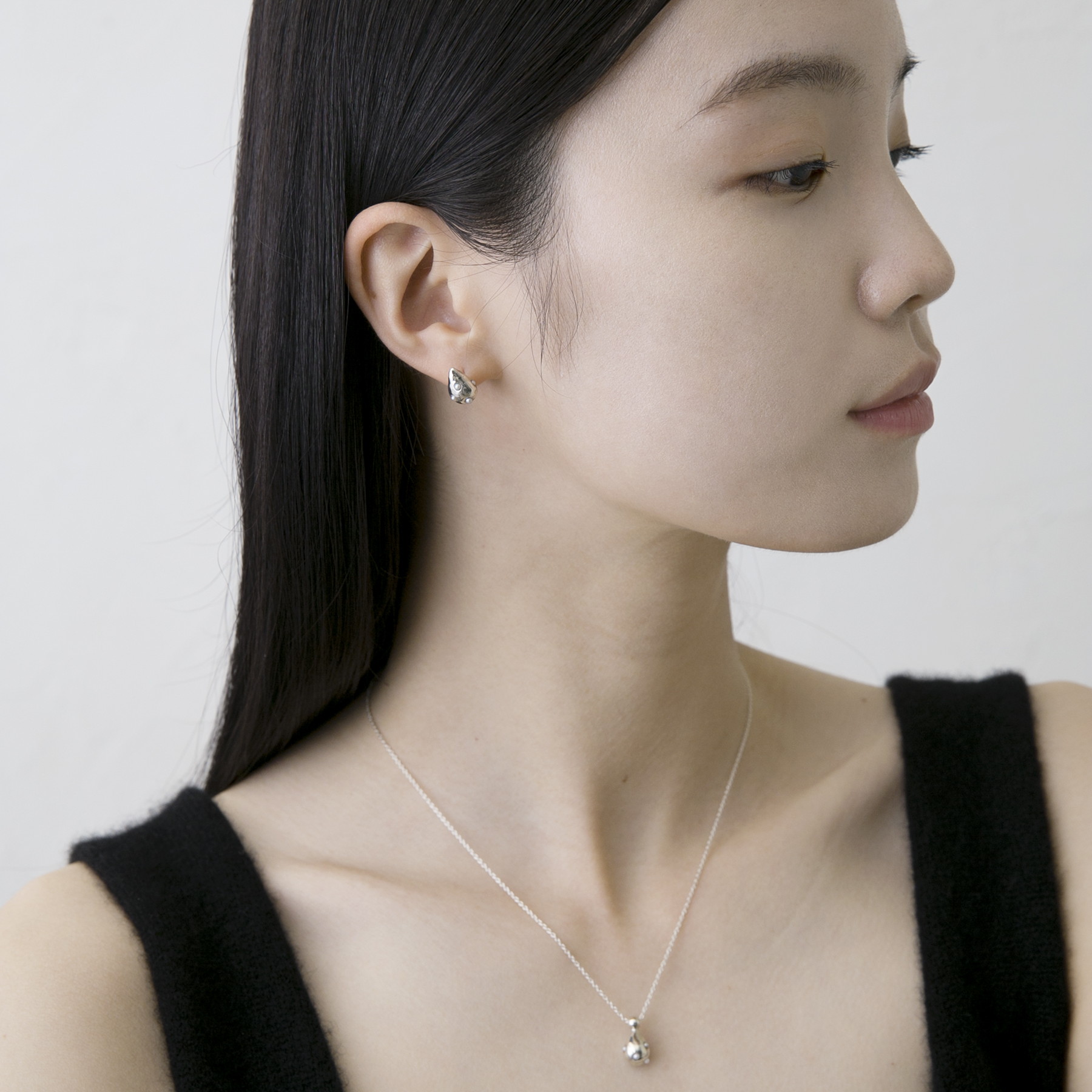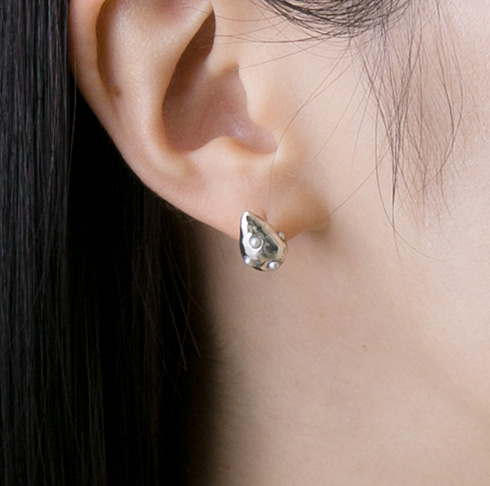 ドロップ型のシルバーパーツに、一つひとつ丁寧に淡水パールの小さな粒を添えています。繊細な技術と感性が息づくその佇まいは、まるで身にまとう小さな芸術品のよう。