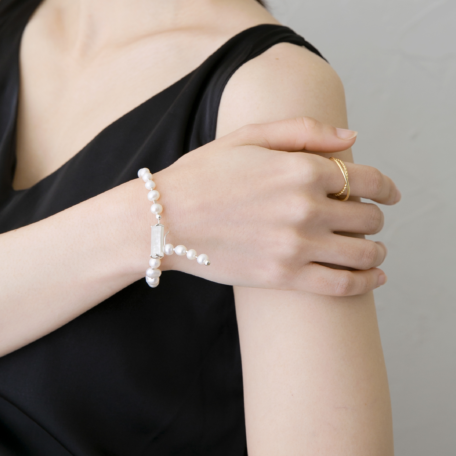 スクエアカットのルースを留め具にしたフックタイプで、パールの間ごとに長さ調整ができ、手首に自然にフィットします。