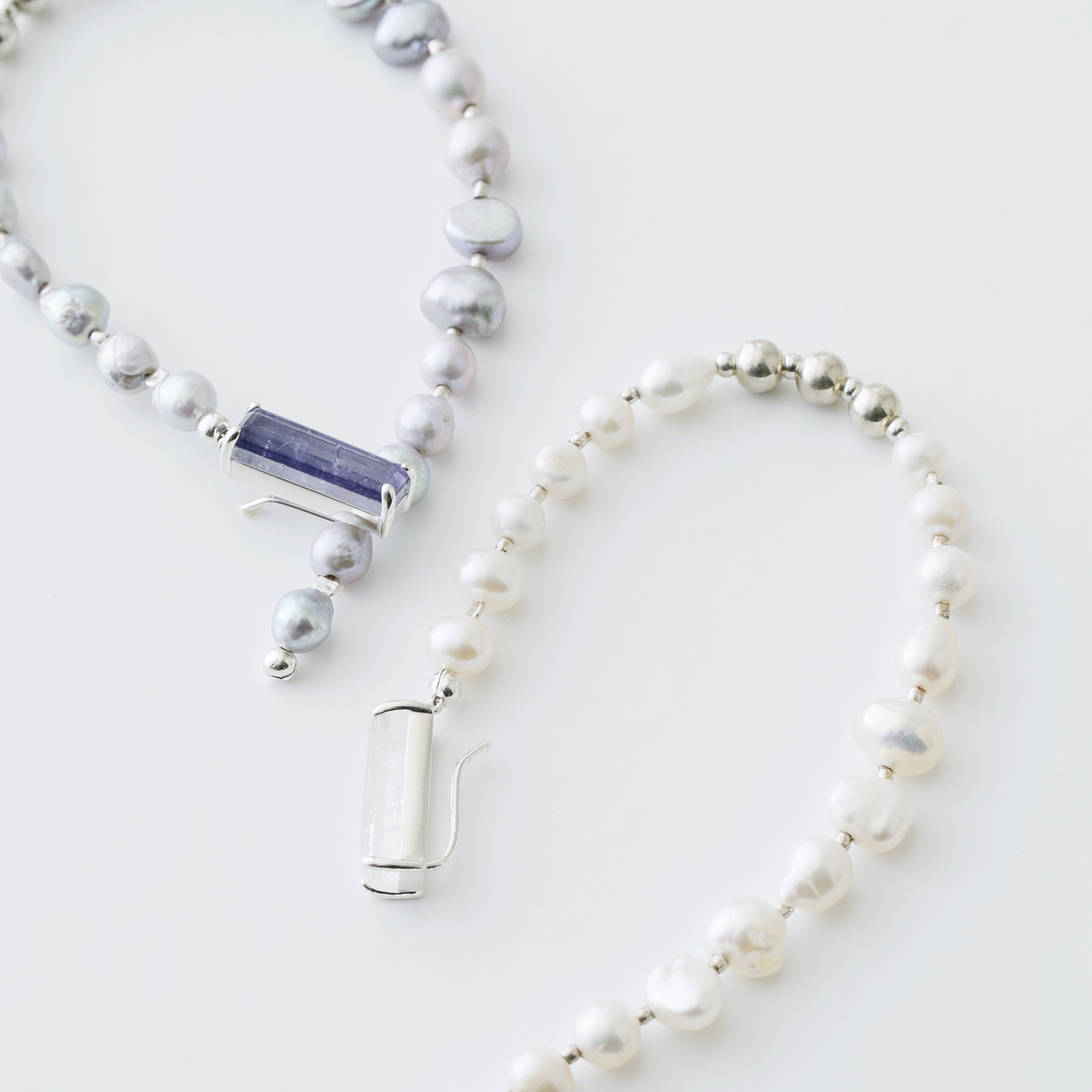 天然パールを一粒ずつ丁寧に組み合わせ、シルバーのパーツをアクセントに。