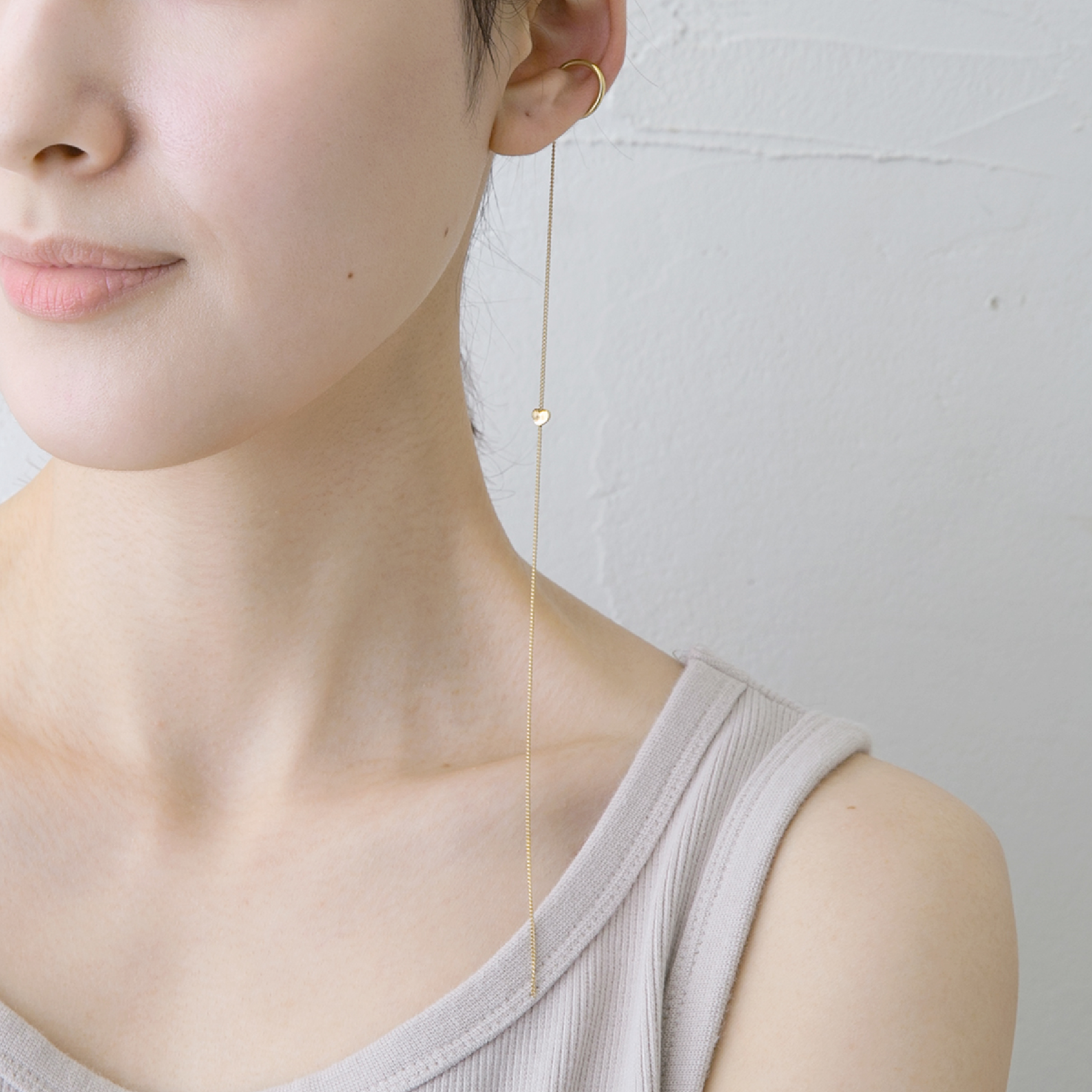 耳元に、ひとすじの光。揺れるチェーンが、静かな存在感を添えます。
